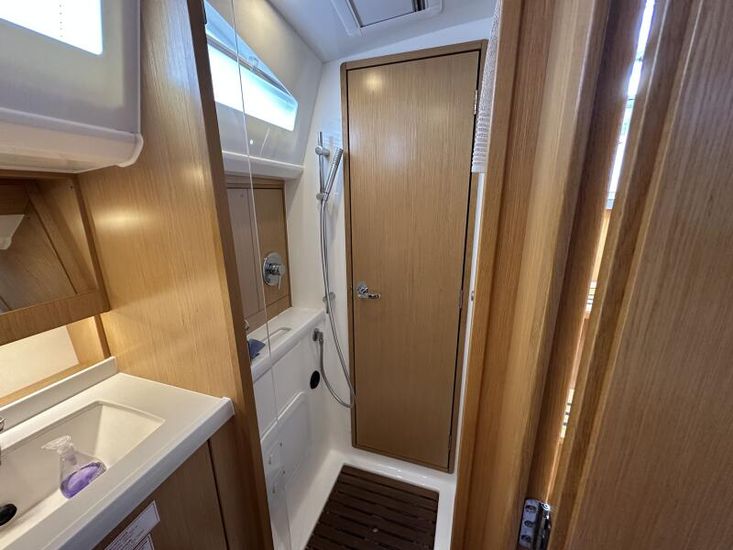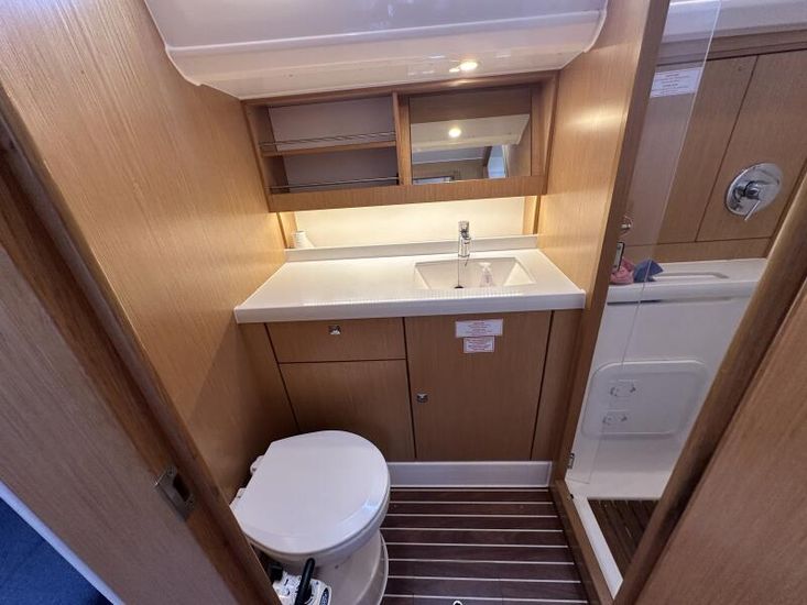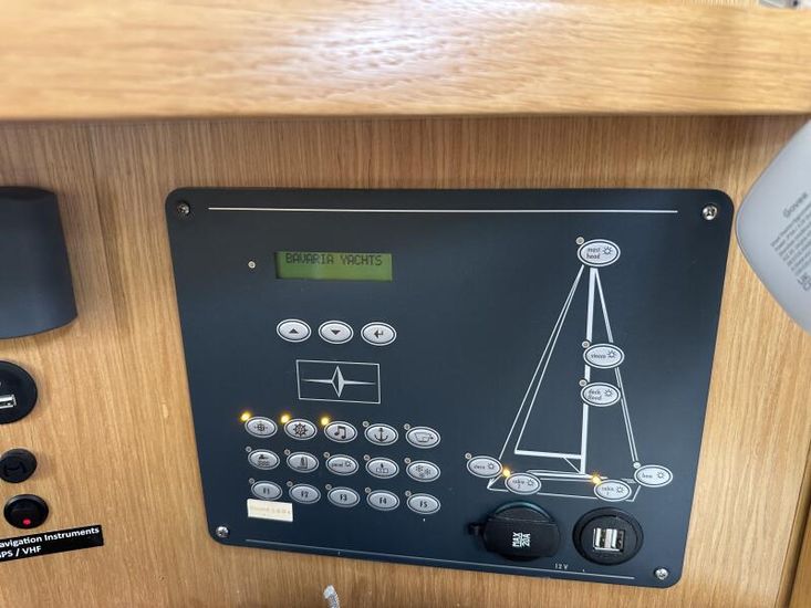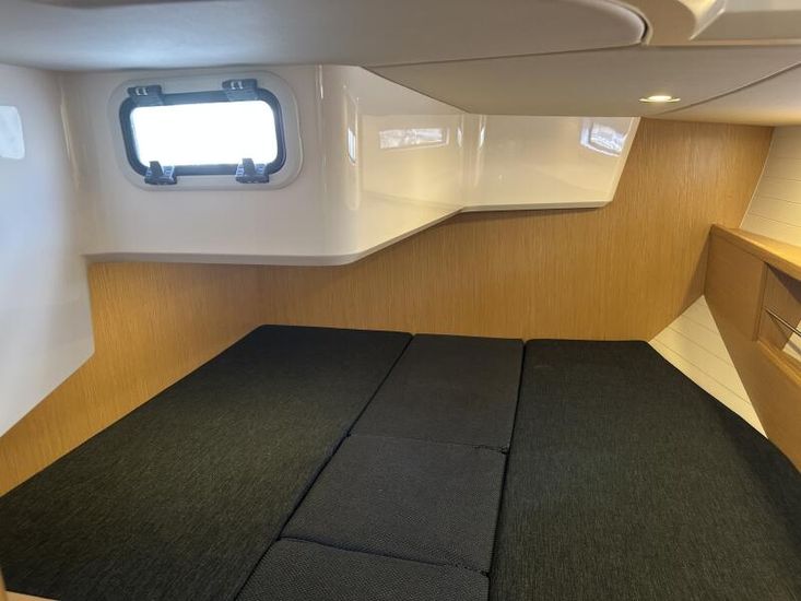 6 berth in 2 cabins and saloonTeak flooringForward cabin with vanity table and stoolAft cabin with infill cushionsAdditional storage starboard aft behind showerSaloon table, foldable and electrically lowerableSide windows with blindsLight package delux with indirect illumination and light spotsLowerable chart tableGalley with twin sinksRefrigerator with freezer boxMicrowaveOven with hob and twin gas burnersManual marine toilet, basin and separate showerFusion sound systemTV with aerialWebasto diesel heating